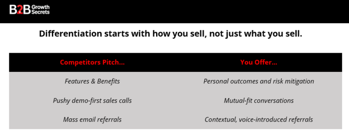 Here's a differentiator your competitors avoid: talk openly about what can go wrong. Ask prospects: "Would you like to know what specific risks you're exposed to in making this decision?"